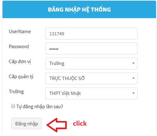 Bước 2. Nhập và chọn các thông tin như hình bên dưới (UserName và Password được cung cấp cho Thầy/Cô qua email) và click Đăng nhập
