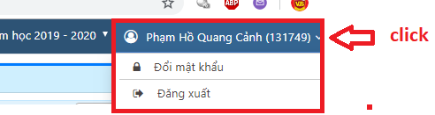 Bước 3. Sau khi đăng nhập thành công, Thầy/Cô kiểm tra tên của mình ở góc trên bên phải (Thầy/Cô có thể Đổi mật khẩu hoặc Đăng xuất bằng cách click vào tên của mình) như hình bên dưới
