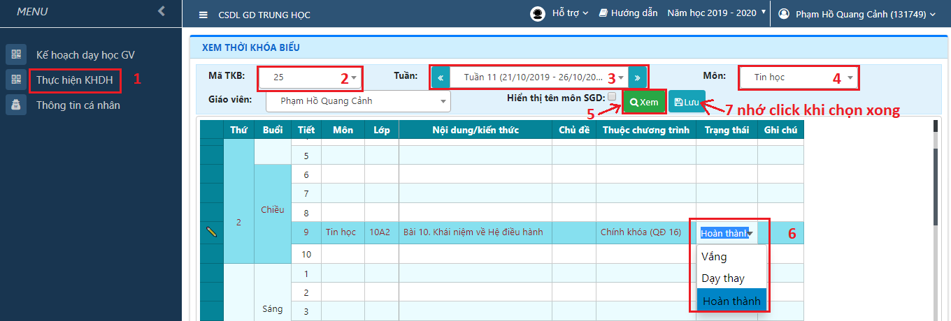 Lần lượt click vào (1) đến (7) như trong hình bên dưới. Lưu ý, cần lập lại các bước (3), (6) và(7) cho các Tuần khác.